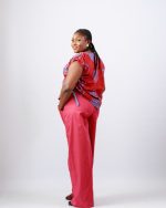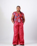 - Two-piece outfit: patterned top + plain crimson trousers